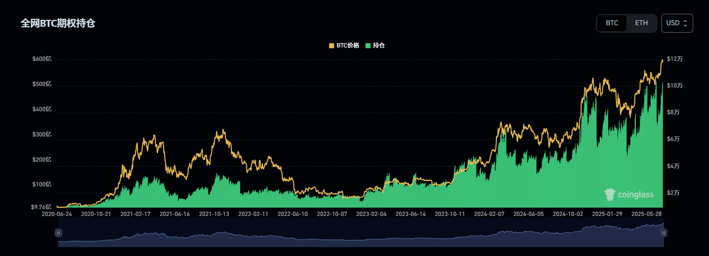與此同時,Coinglass 數據顯示,截至周二,比特幣期權未平倉合約突破 500 億美元,創下歷史新高。該指標的持續上漲通常意味著更多大型機構參與購買比特幣,因為較大的投資者傾向於持有更大的長期頭寸並使用期權進行對沖。