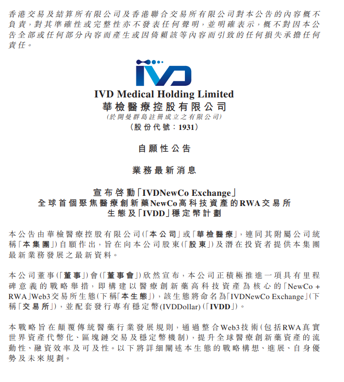 Techub News 消息,香港聯合交易所官方信息披露係統顯示,7 月 17 日華檢醫療 (01931.HK)發佈公告,宣佈正式啓動「IVDNewCo Exchange」生態計劃,推出全球首個聚焦醫療創新藥 NewCo 高科技資産的 RWA 交易所生態及配套發行 IVDD 穩定幣計劃。