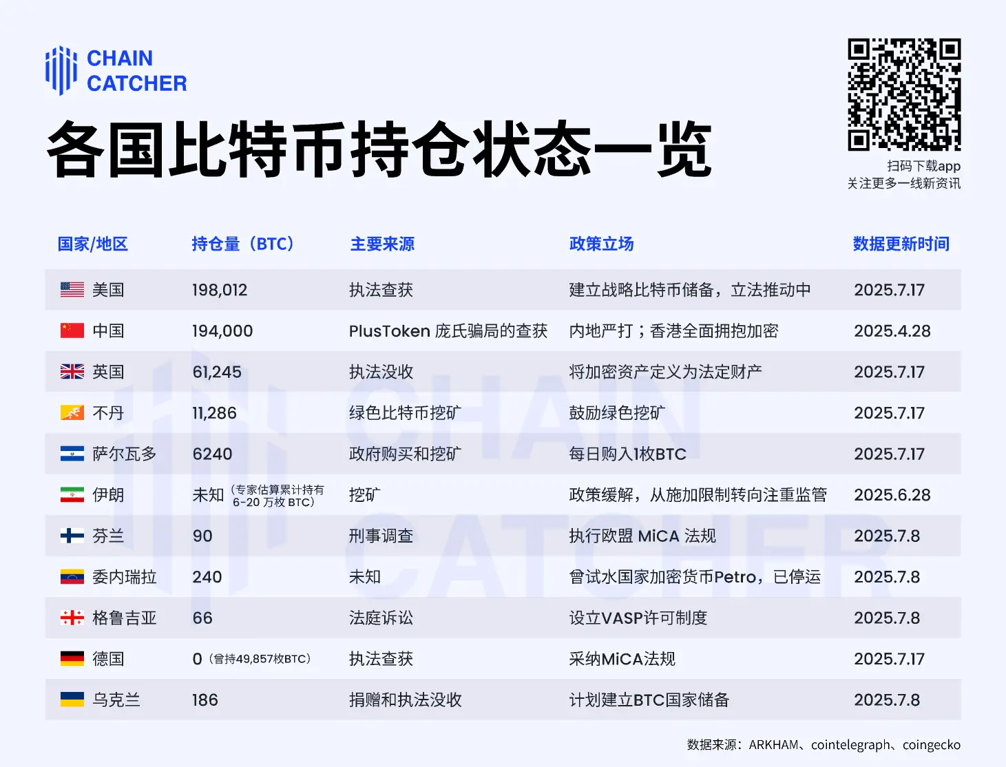 直接上干货:下表汇总了各国的比特币持仓数量、来源渠道及政策态度,速览「国家队」的加密资产版图。