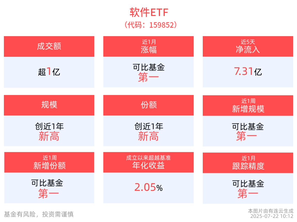 資金流入方面,軟件ETF最新資金淨流入6735.91萬元。拉長時間看,近5個交易日内有4日資金淨流入,合計「吸金」7.31億元。
