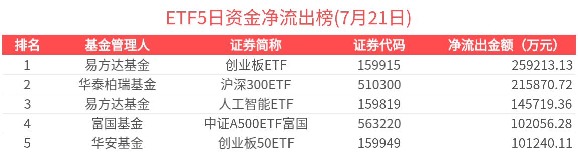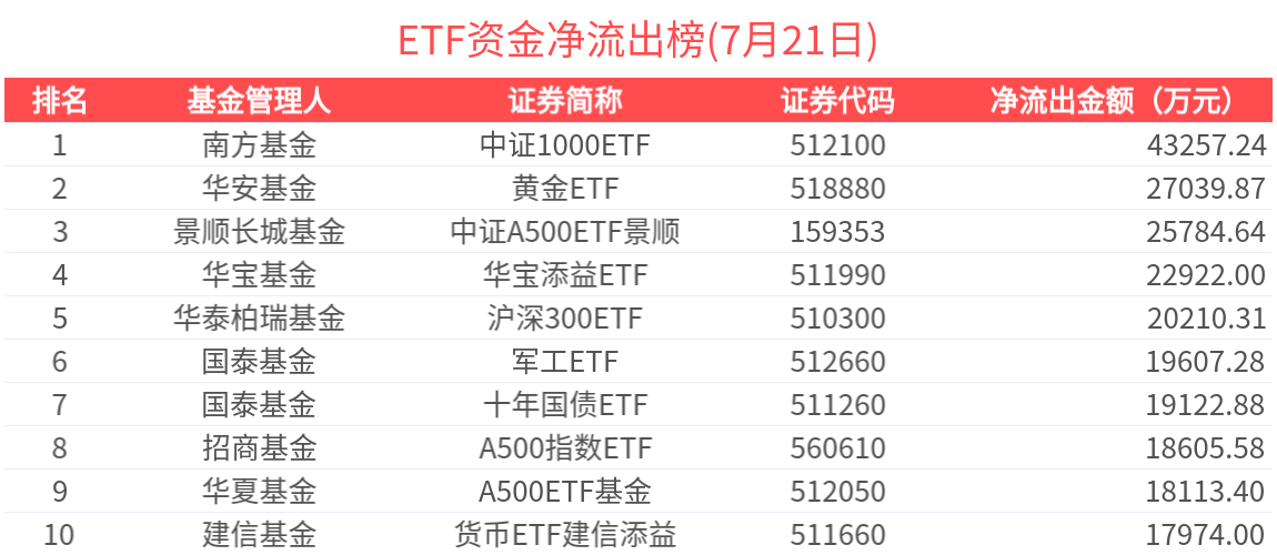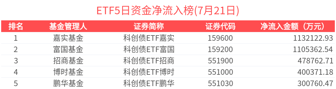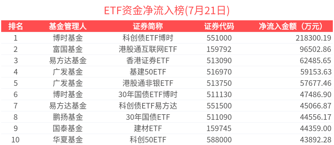 2025年7月21日共263只ETF基金獲資金淨流入,458只ETF基金淨流出。淨流入金額超1億元的有34只,科創債ETF博時(551000.SH)、港股通互聯網ETF(159792.SZ)、香港證券ETF(513090.SH)、基建50ETF(516970.SH)、港股通非銀ETF(513750.SH)資金顯著流入,分別淨流入21.83億元、9.65億元、6.25億元、5.92億元、5.77億元(淨申購份額*單位淨值)。