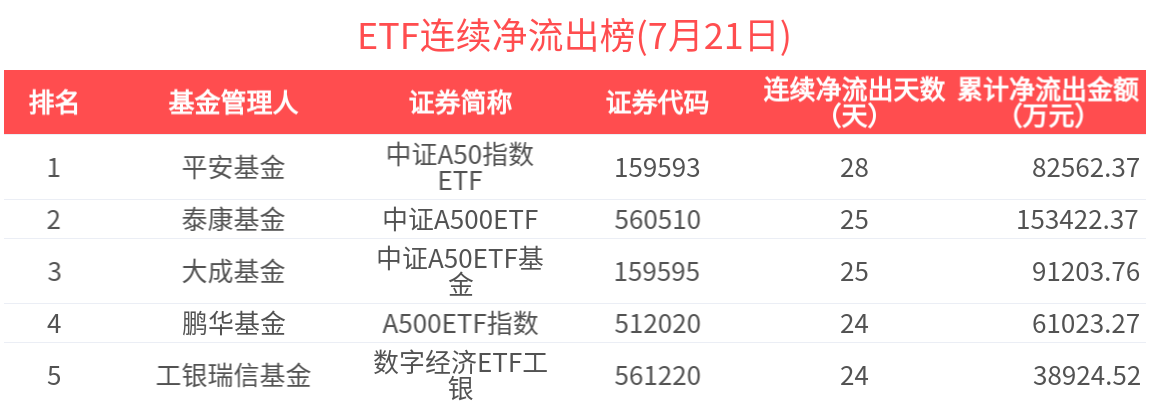 連續淨流出的ETF基金有285只,居前的為中證A50指數ETF(28天)、中證A500ETF(25天)、中證A50ETF基金(25天)、A500ETF指數(24天)、數字經濟ETF工銀(24天),分別淨流出8.26億元、15.34億元、9.12億元、6.10億元、3.89億元。其中,中證A500ETF近25天加速流出,近25天累計流出15.34億元,基金規模快速下降至52.21億元。