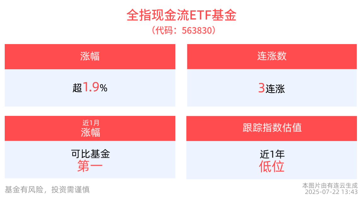 截至2025年7月22日 13:43,中證全指自由現金流指數(932365)強勢上漲1.94%,成分股昊華能源(601101)上漲10.06%,陝西煤業(601225)上漲8.80%,海峽股份(002320)上漲6.48%,神火股份(000933),洛陽鉬業(603993)等個股跟漲。全指現金流ETF基金(563830)上漲1.98%, 沖擊3連漲。最新價報1.08元。拉長時間看,截至2025年7月21日,全指現金流ETF基金近1周累計上漲2.02%,漲幅排名可比基金1/12。
