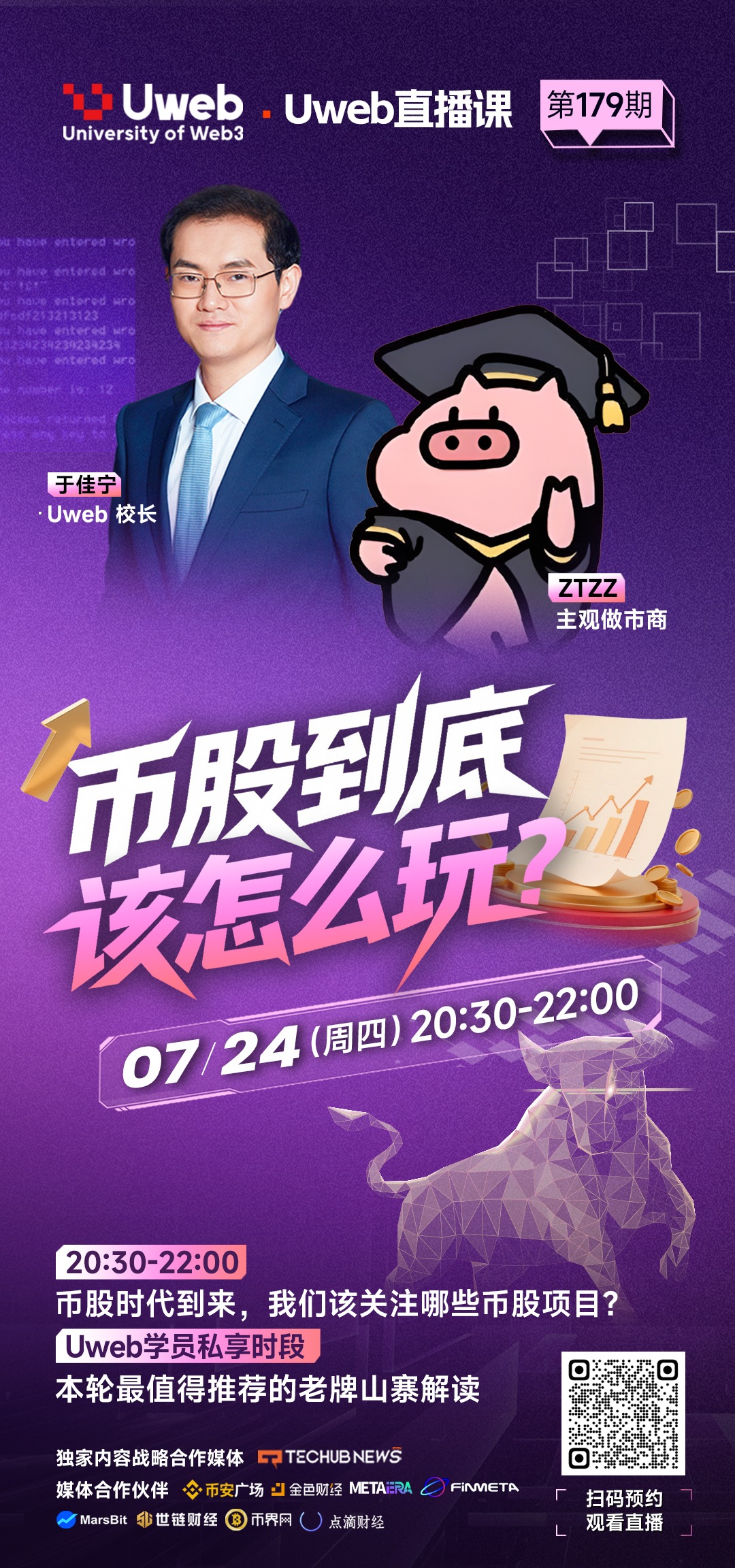 内容整理:Peter_Techub News 本文所分享的全部信息僅作參考,不構成任何形式的投資建議。投資者在做出投資決策時,應進行獨立的研究與判斷,並充分考慮自身的財務狀況、投資目標和風險承受能力。 2025年7月24日晚,Uweb直播課第179期以“幣股到底該怎麼玩?”為主題,聚焦加密貨幣與傳統股市的融合趨勢,邀請Uweb校長於佳寧主持,主觀做市商ZTZZ做客,圍繞三大核心板塊展開深入探討:本輪行情的進展、參與幣股聯動的美股公司及其風險與配置策略、以及本輪牛市中最值得關注的老牌山寨幣。本期節目結合宏觀經濟、行業動態與莊家視角,為投資者提供了係統性的洞見與實踐指導。以下是對主持人於佳寧與嘉賓ZTZZ分享内容的總結,涵蓋三大主題的核心問題與關鍵觀點。