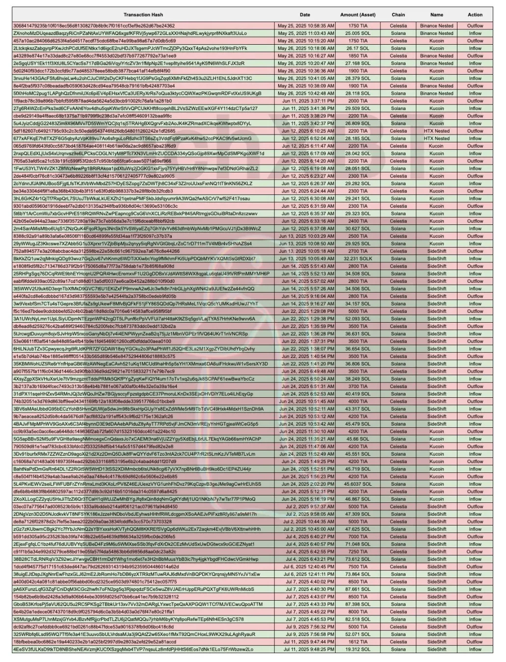 以下是其通過時間分析識別出的 Celestia 到 Solana 的即時兌換交易表格: