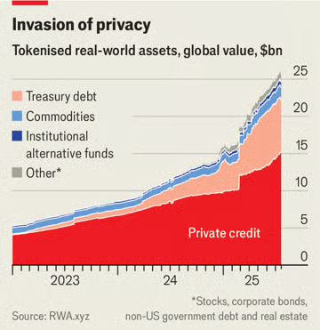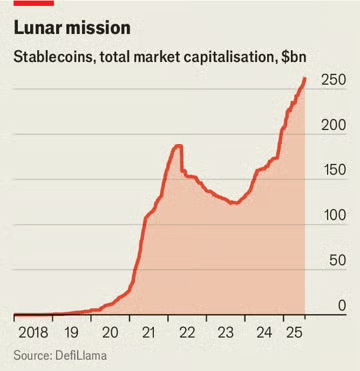 然而,最新一波熱潮卻有所不同。7 月 18 日,唐納德·特朗普總統簽署《穩定幣法案》 (GENIUS Act),為穩定幣(以傳統資産(通常是美元)為支撐的加密代幣)提供了業内人士長期渴望的監管確定性。該行業正處在蓬勃發展期;華爾街人士如今正爭相參與其中。「代幣化」也正在興起:鏈上資産交易量迅速增長,包括股票、貨幣市場基金,甚至私募股權和債務。