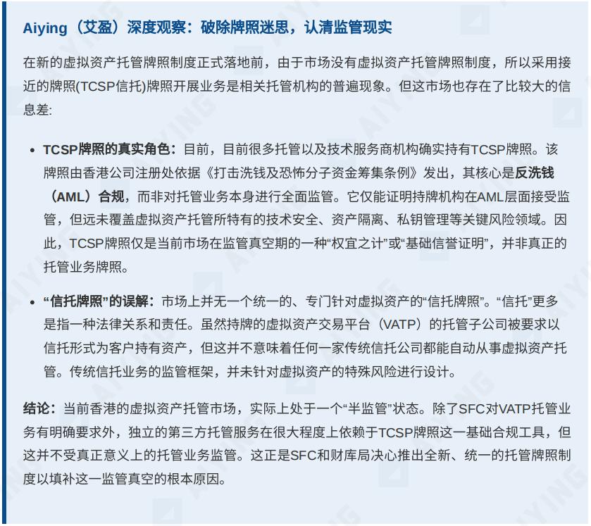 香港為虛擬資産託管業務制定的監管框架,雖然帶來了挑戰,但更重要的是創造了前所未有的確定性和機遇。它通過引入「信任」這一核心要素,為機構資金的入場鋪平了道路,也為整個虛擬資産生態(包括現貨 ETF、RWA 代幣化等)的健康發展奠定了堅實基礎。Aiying(艾盈)將持續與業界同仁並肩,憑借專業的洞察和豐富的經驗,共同迎接香港虛擬資産託管業務更加廣闊的未來。下期將為大家解讀香港 OTC 法案的最新動態和「情報」,敬請關注!