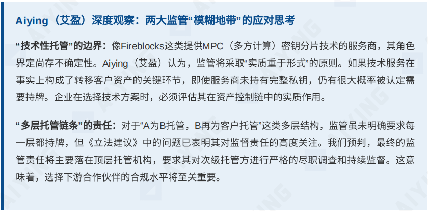 根據《立法建議》第 2.13 段,任何以業務形式「代客戶保管虛擬資産」或「保管能轉移客戶虛擬資産的工具(包括但不限於私鑰)」的實體,都將被納入監管範圍。這一定義具有顯著的「穿透式」特徵,核心在於是否掌握客戶資産的實際控制權。