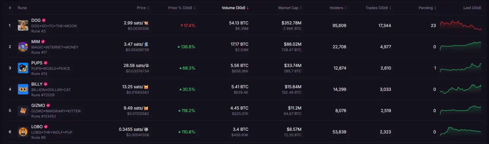 雖然過去一周最有名的符文 $DOG 以及它的 NFT Runestone 都在下跌,但是把時間綫拉長到 30 天的話,有多個符文表現相當優異。包括 Bitcoin Wizard 的 $MIM,Bitcoin Puppets 的 $PUPS、「百億貓」$BDC 和 Bitcoin Puppets 衍生出來的 $GIZMO。