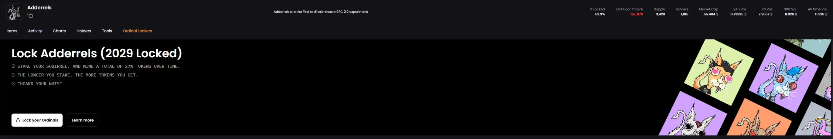 這個項目的亮點主要是華語社區大力支持、第一個 BRC 2.0 NFT 項目以及有後續的發幣計劃(分配給持有和質押的份額總計將有 55%)。它的總量只有 3420 個,但目前已經有 2029 個被質押,質押率接近 60%。此外,在 Magic Eden 上的掛單量也只有 225 個。