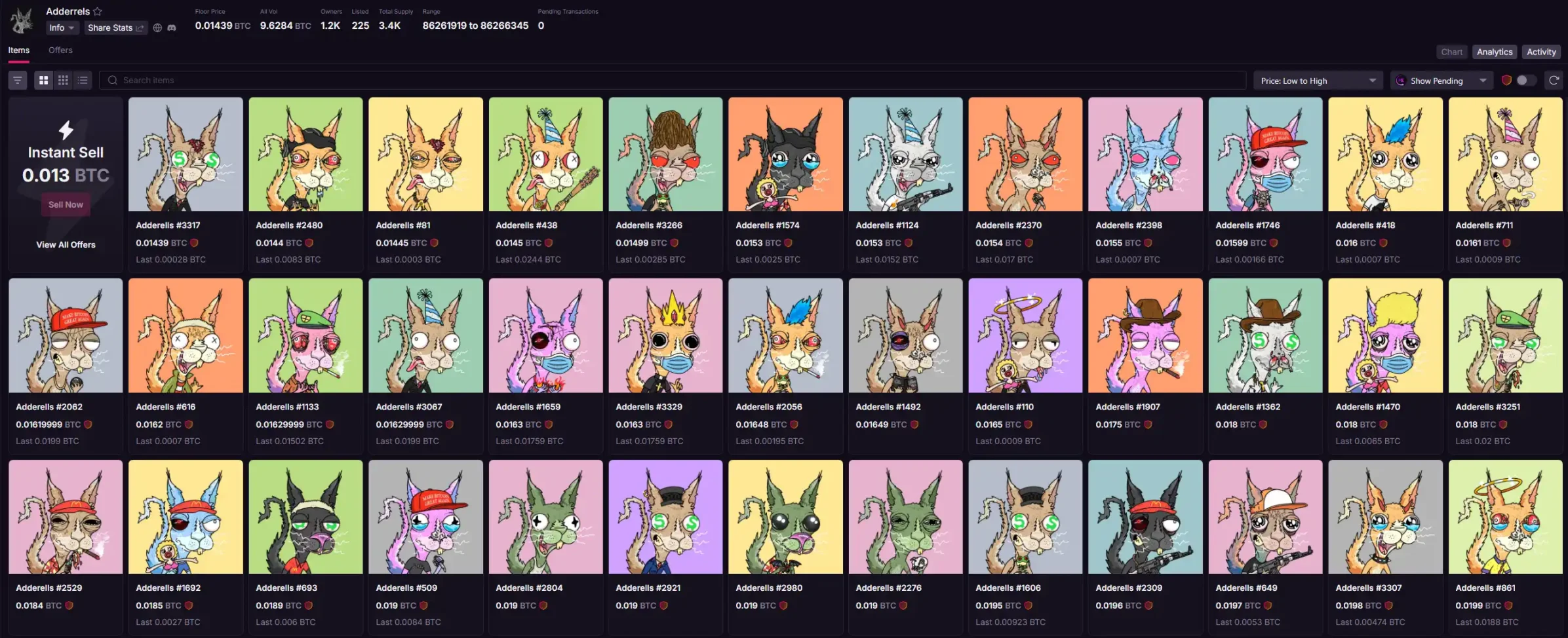 盡管有不盡完美的地方,但 BRC20 絕對是比特幣生態華語力量最堅實的資産協議,這也是 BRC20 協議一直以來最大的優勢。Adderrels 作為第一個 BRC 2.0 NFT 項目,目前從地板價和成交量看都是當之無愧的 BRC 2.0 龍頭,目前地板價為 0.0143 BTC(約為 1687 美元),過去 7 天成交量突破 6 BTC(約為 73 萬美元)。