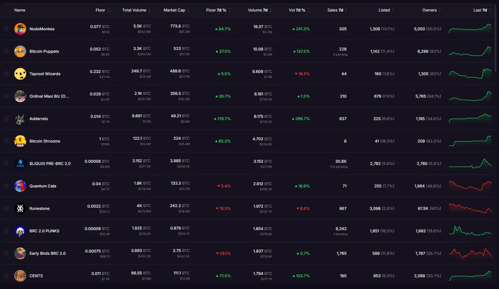 不過從交易量看,我們可以看到老牌比特幣 NFT 係列仍然有著吸引力,並且龍頭梯隊也沒有怎麼變化,依然是 NodeMonkes、Bitcoin Puppets、Taproot Wizards 以及 OMB 這「四大金剛」。這些項目相比於自己的巅峰仍然相去甚遠,這一波的回暖可能受益於比特幣的強勢以及以太坊 NFT 龍頭們如 CryptoPunks 在近段時間的優秀表現。