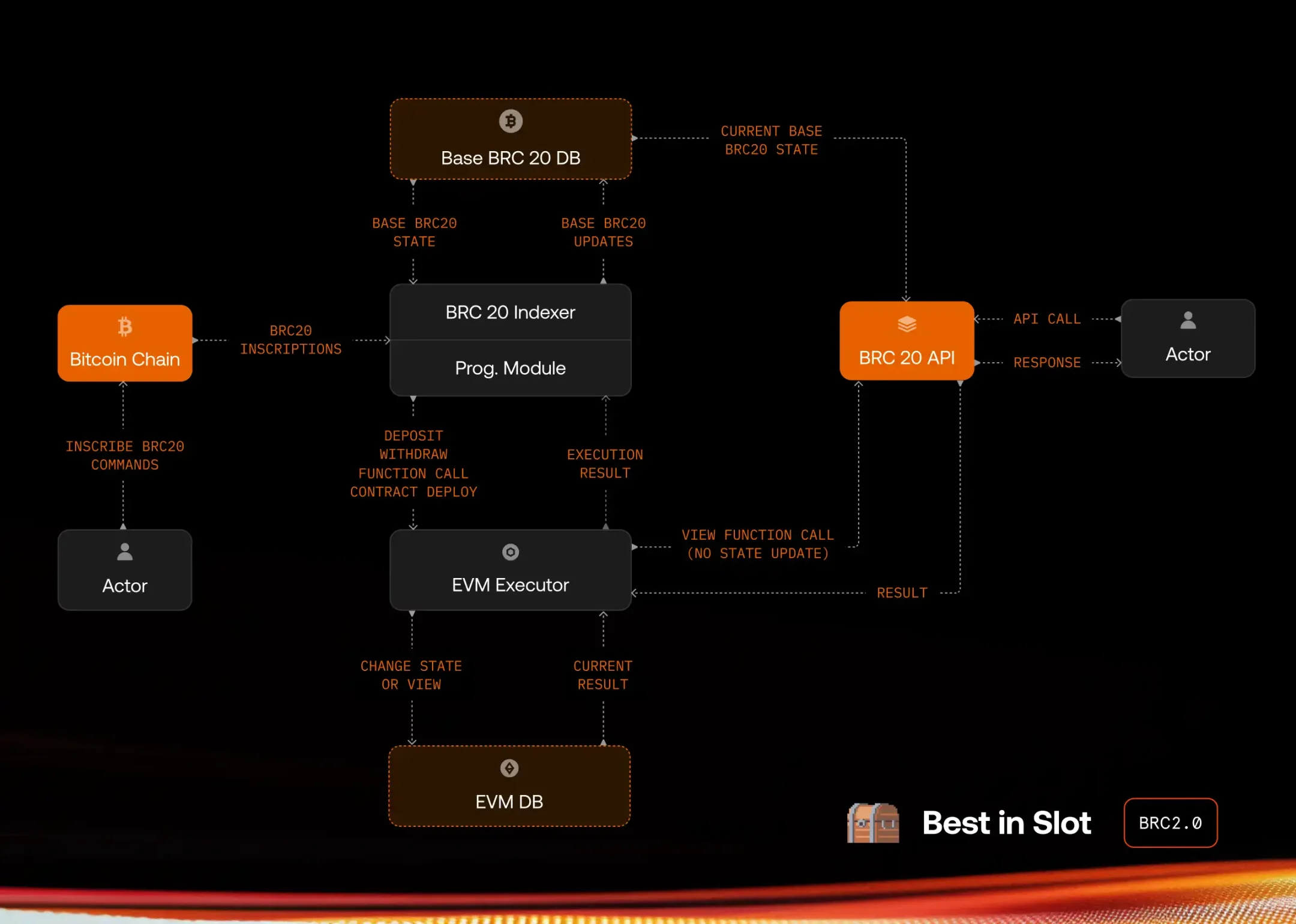 這個大更新得到了由 BRC20 創建者 domo 領導創建的 Layer 1 基金會(L1F)的支持。從下面的技術架構圖可以看到,BRC 2.0 支持智能合約的方法是使用了一個鏈下的「EVM 執行器」。根據這張圖裡展現出來的工作流程,不但智能合約是在鏈下執行,而且只是把「發起合約交互行為」和「合約交互結果」給上鏈了,那麼合約狀態和執行情況就是個「黑箱」。