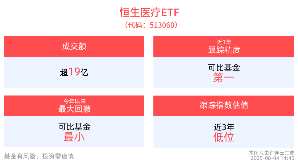 跟蹤精度方面,截至2025年8月1日,恒生醫療ETF近1年跟蹤誤差為0.060%,在可比基金中跟蹤精度最高。