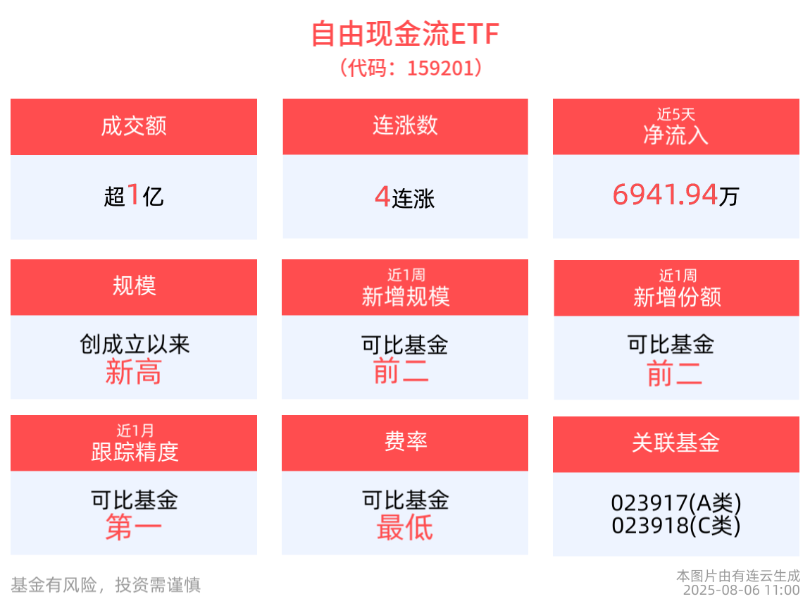 流動性方面,自由現金流ETF盤中換手3.47%,成交1.40億元。拉長時間看,截至8月5日,自由現金流ETF近1周日均成交3.28億元,排名可比基金第一。