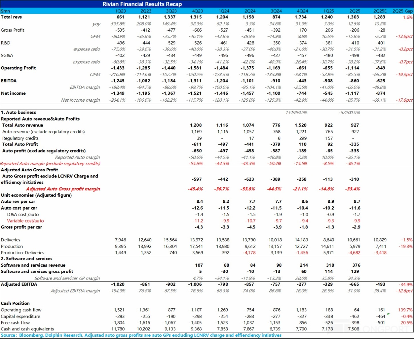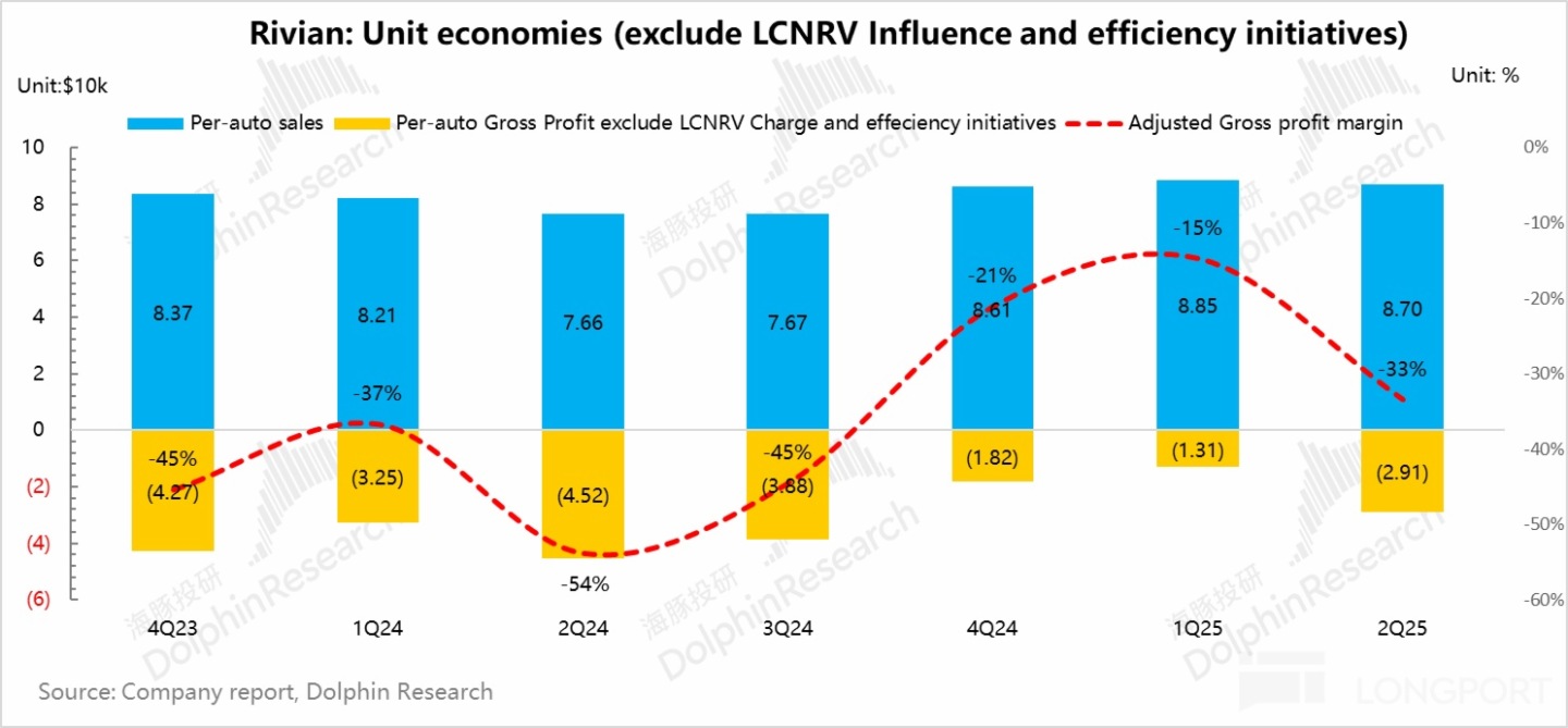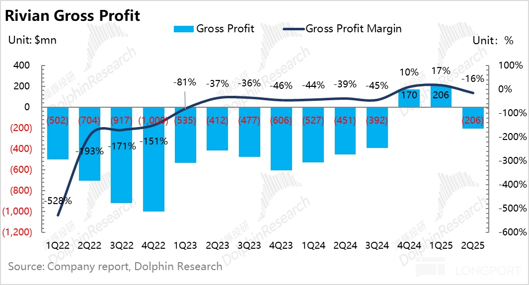 1)二季度業績再次跌入谷底,毛利率大幅邊際惡化:從本季度毛利率表現來看,Rivian 再次陷入了深虧模式,雖然說由於 Rivian 二季度産量受關稅帶來的對供應鏈的負面影響,疊加監管積分的退坡,市場本來就對 Rivian 這份財報期待值不高,二季度毛利率又再次轉負在市場預期之内,但此次實際報表端毛利率比市場預期還要差。