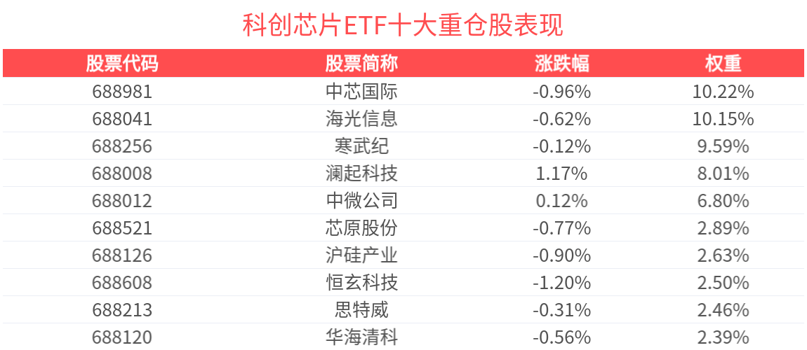 數據顯示,截至2025年7月31日,上證科創板芯片指數前十大權重股分別為寒武紀、中芯國際、海光信息、瀾起科技、中微公司、芯原股份、滬矽産業、恒玄科技、華海清科、思特威,前十大權重股合計佔比57.59%。