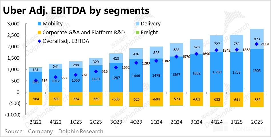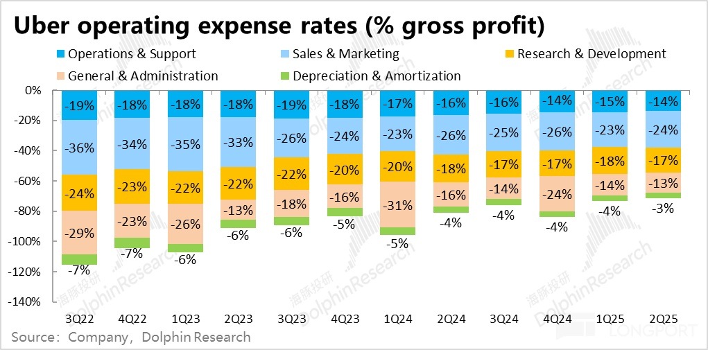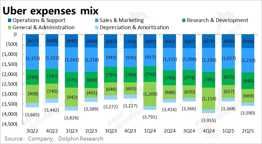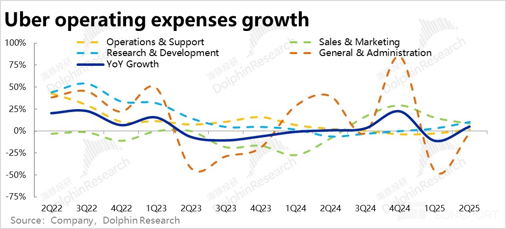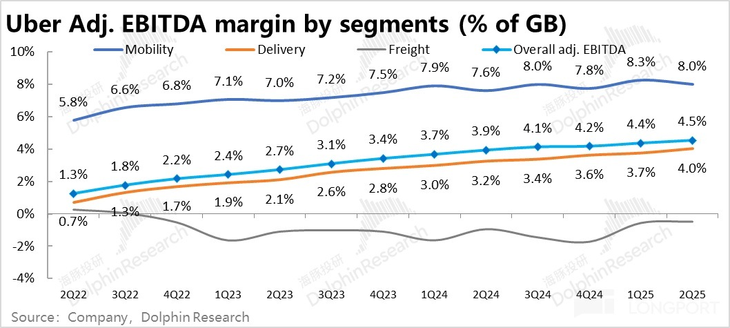 3)Uber 在費用管控上的效果依舊出色,在繼續釋放利潤率。不過趨勢上,近 2~3 個季度 adj.EBITDA 利潤率提升的速度在逐漸放緩。後續利潤增長可能會進一步向營收增速靠攏。