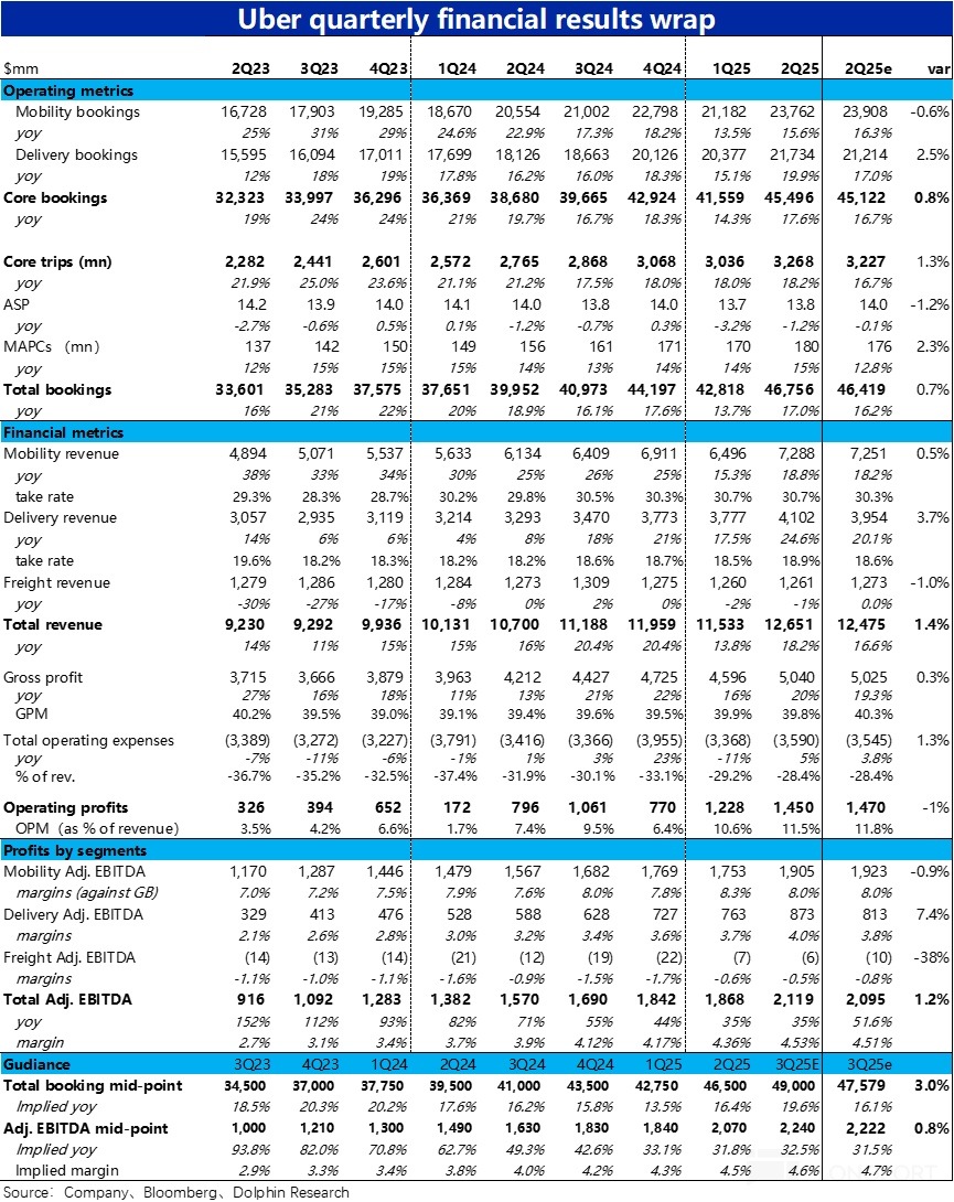 「國際滴滴」$優步(UBER.US) 在 8 月 6 日晚美股盤前,發佈了 2025 年 2 季度財報,整體來看表現平穩,亮眼和缺陷之處都不多,詳細要點如下:
