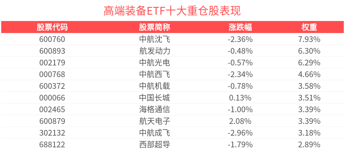 數據顯示,截至2025年7月31日,中證高端裝備細分50指數前十大權重股分別為中航沈飛、航發動力、中航光電、中航西飛、菲利華、中航機載、中國長城、航天電子、海格通信、中航成飛,前十大權重股合計佔比46.03%。