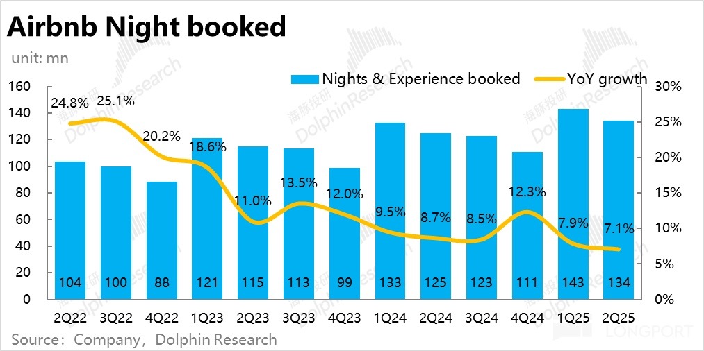 整體來看,單看本季 Airbnb 業績的財報指標其實並不差,在變現率明顯走高的幫助下,營收額,毛利潤,adj.EBITDA 利潤全面好於預期,趨勢上同比增長也都有提速。但問題在於,公司本季財務指標實際更多反映的是早先預訂的實際交付情況,屬於滯後指標。