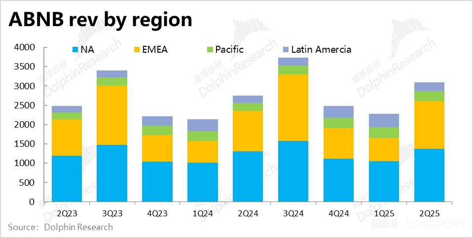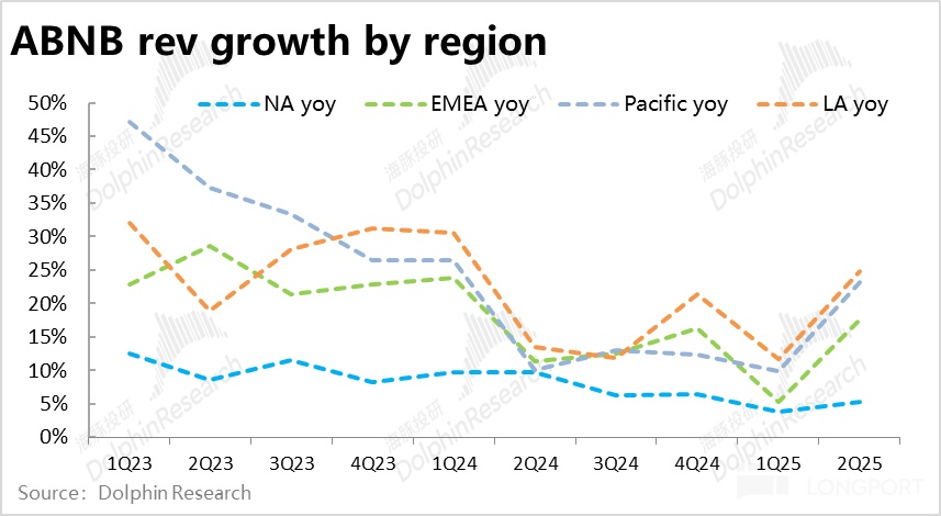 好在,兩個新興市場大洲的增長仍明顯更強,南美和亞太地區間夜預訂量增速則分別達到高十幾% 和中十幾%,不過拉美相比上季低二十% 的增長同樣是有所放緩的。