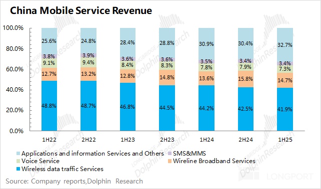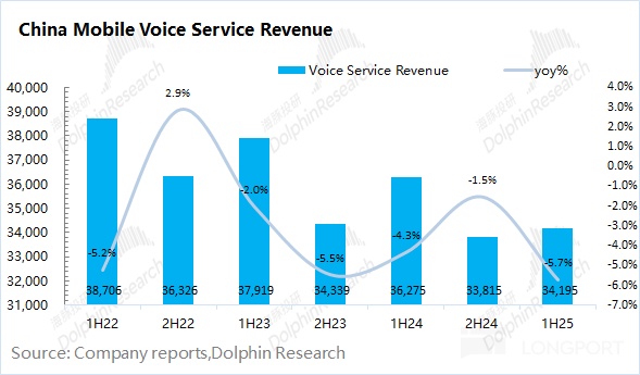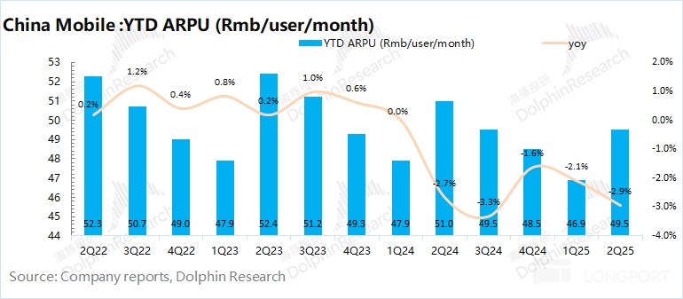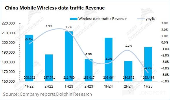 中國移動流量業務 2025 年上半年收入 1955 億元,同比下滑 4.7%。受益於短視頻等需求的流量使用量增加,但單位資費仍是下滑的,最終導致流量業務的繼續下滑。