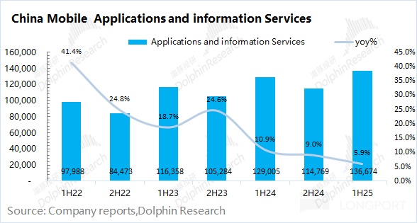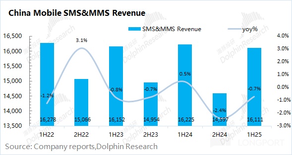 2)短彩信業務:公司 2025 年上半年實現收入 161 億元,同比下降 0.7%。中國移動的短彩信業務在經歷即時通訊軟件的沖擊後,現在已經趨於平穩。當前公司短彩信業務的客戶主要以銀行等 b 端客戶為主。海豚君認為,短彩信業務當前的 to B 需求依然會存在,並將保持相對平穩的狀態。
