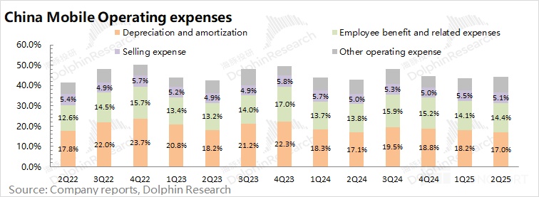 中國移動 2025 年第二季度經營費用 1240 億元,同比增長 2.3%,相對平穩。海豚君將 「銷售費用」、「僱員薪酬費用」、「折舊及攤銷」 和 「其他營運支出」 四項都放在經營費用中;