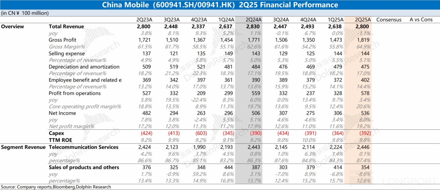 1、經營數據:收入持平,利潤穩增。$中國移動(00941.HK) 2025 年第二季度總營收為 2800 億元,同比下滑 1.1%。公司本季度通訊業務同比持平,收入端的下滑主要是受産品銷售及其他業務的下滑影響。中國移動 2025 年第二季度淨利潤為 536 億元,同比增長 6%。在收入下滑的情況下,利潤端的增長來自於毛利率的提升;