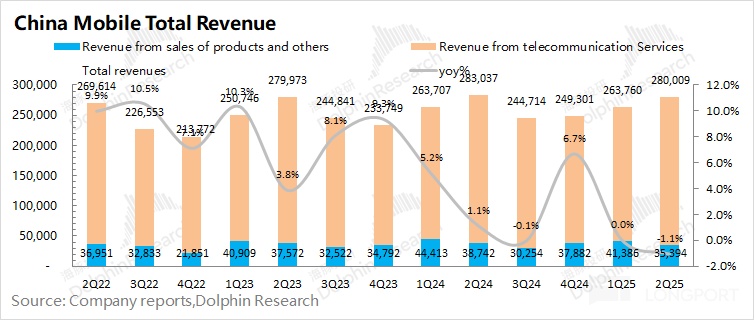 中國移動 2025 年第二季度總營收 2800 億元,同比小幅回落。分項來看,其中公司本季度來自於通訊服務的收入為 2446 億元,同比持平;來自産品銷售及其他的收入為 354 億元,同比下滑 8.6%。