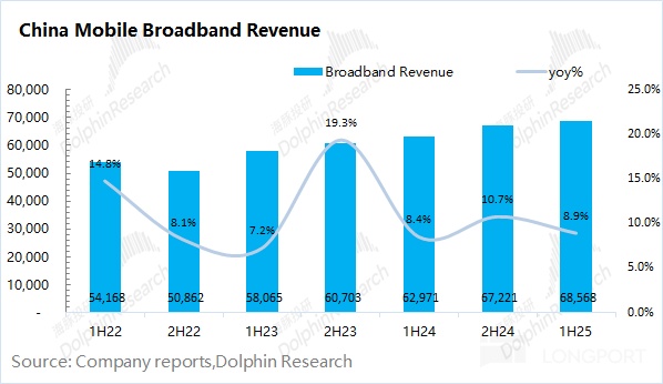 中國移動寬帶業務 2025 年上半年收入 686 億元,同比增長 8.9%。公司的寬帶業務繼續維持增長的態勢,主要得益於公司在寬帶市場份額的增加。