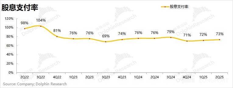 b)分紅情況:公司本季度分紅回購 494 億元,符合海豚君此前 500 億元的預期。由於公司通常在二季度/三季度進行分紅,估算下季度分紅 530 億元左右,估算當前公司的股息支付率在 73%,依然維持在 70% 上方。
