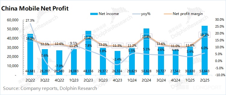 中國移動 2025 年第二季度淨利潤 536 億元,同比增長 6%。在收入下滑的情況下,利潤端的增長,主要來自於毛利率的提升和經營費用端的減少。