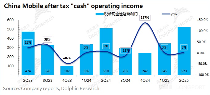 隨著 5G 高投入期的收尾,中國移動的資本開支已經明顯回落。由於當前公司資本開支逐步回落,而攤銷折舊仍然較高,那麼公司的現金性經營利潤將比財報中的經營利潤更高,公司實際上也是更加賺錢的。海豚君測算公司本季度稅後現金性經營利潤為 523 億元,同比增長 3%。