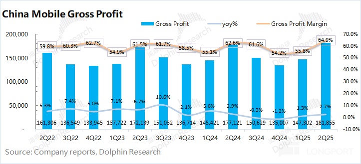 中國移動 2025 年第二季度毛利率 64.9%,同比提升 2.3pct。海豚君將 「網絡運營及支撐成本」 和 「銷售産品成本」 列為營業成本,進而測算公司毛利及毛利率情況。