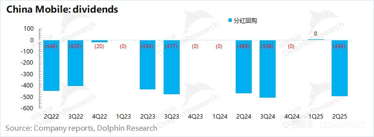 4、ROE 及分紅情況:$中國移動(600941.SH) 本季度的 TTM ROE 為 9.8%,季度環比持平。從上半年的 ROE 來看,同比去年有明顯的提升。公司在二季度的分紅回購達到 494 億元,進而估算公司當前的股息支付率繼續維持在 70% 以上。