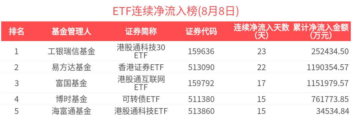 近期連續淨流入的ETF基金有146只,居前的為港股通科技30ETF(23天)、香港證券ETF(22天)、港股通互聯網ETF(17天)、可轉債ETF(15天)、港股通科技ETF(15天),分別淨流入25.24億元、119.04億元、115.20億元、76.18億元、3.45億元。