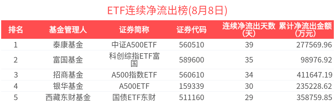連續淨流出的ETF基金有219只,居前的為中證A500ETF(39天)、科創綜指ETF富國(35天)、A500指數ETF(34天)、A500ETF(30天)、國債ETF東財(29天),分別淨流出27.76億元、9.90億元、41.16億元、23.52億元、35.88億元。
