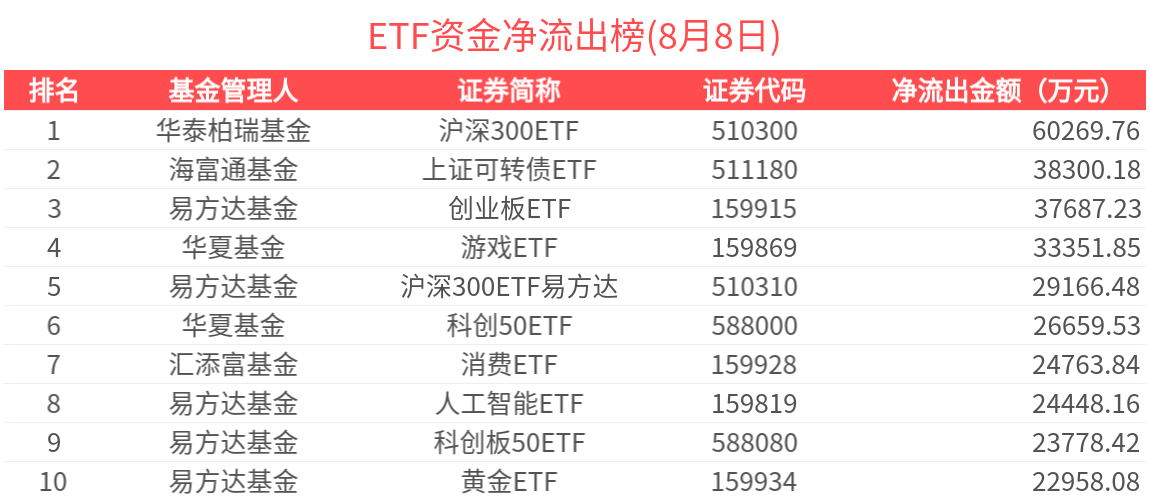 淨流出金額超1億元的有26只,滬深300ETF(510300.SH)、上證可轉債ETF(511180.SH)、創業板ETF(159915.SZ)、遊戲ETF(159869.SZ)、滬深300ETF易方達(510310.SH)資金顯著流出,分別淨流出6.03億元、3.83億元、3.77億元、3.34億元、2.92億元(淨贖回份額*單位淨值)。