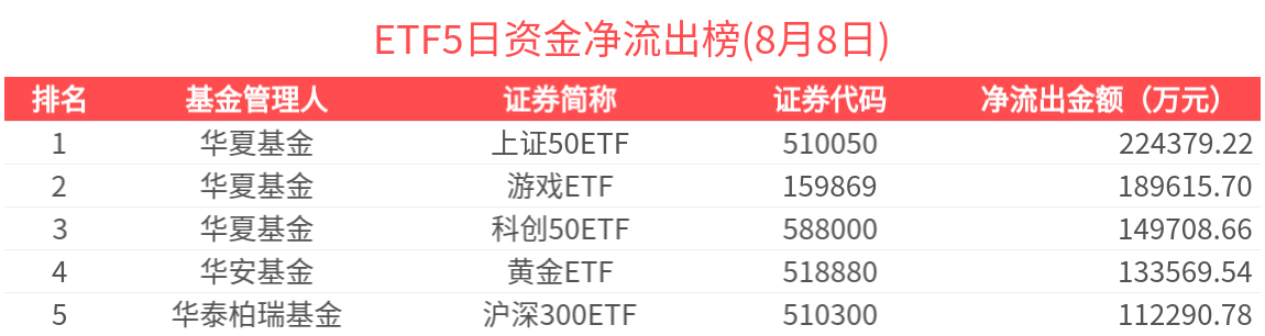 近5天累計淨流出超過1億元的有77只,金額居前的為上證50ETF、遊戲ETF、科創50ETF、黃金ETF、滬深300ETF等,分別淨流出22.44億元、18.96億元、14.97億元、13.36億元、11.23億元。其中,上證50ETF近5天資金大幅淨流出,基金規模快速下降至1673.41億元。