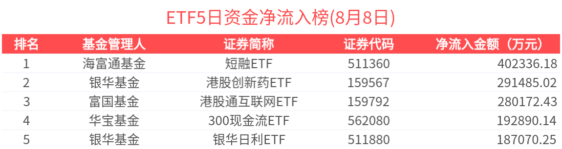 2025年8月8日共273只ETF基金獲資金淨流入,383只ETF基金淨流出。淨流入金額超1億元的有25只,短融ETF(511360.SH)、300現金流ETF(562080.SH)、科創債ETF嘉實(159600.SZ)、科創芯片ETF(588200.SH)、港股創新藥ETF(513120.SH)資金顯著流入,分別淨流入22.74億元、18.15億元、6.00億元、5.58億元、5.33億元(淨申購份額*單位淨值)。