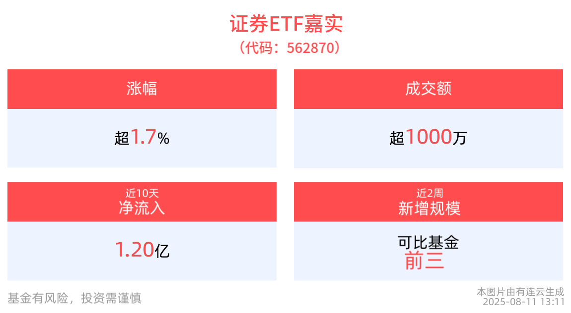 截至2025年8月11日 13:11,中證全指證券公司指數強勢上漲1.73%,成分股國盛金控10cm漲停,湘財股份上漲4.45%,華鑫股份上漲3.50%,東方財富、東吳證券等個股跟漲。證券ETF嘉實(562870)上漲1.79%。