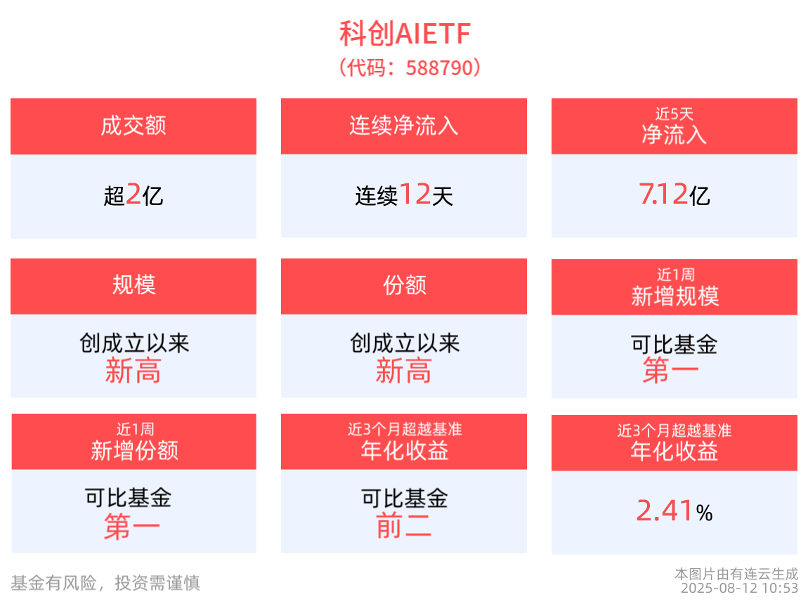 流動性方面,科創AIETF盤中換手3.44%,成交2.39億元。拉長時間看,截至8月11日,科創AIETF近1周日均成交4.92億元,居可比基金第一。