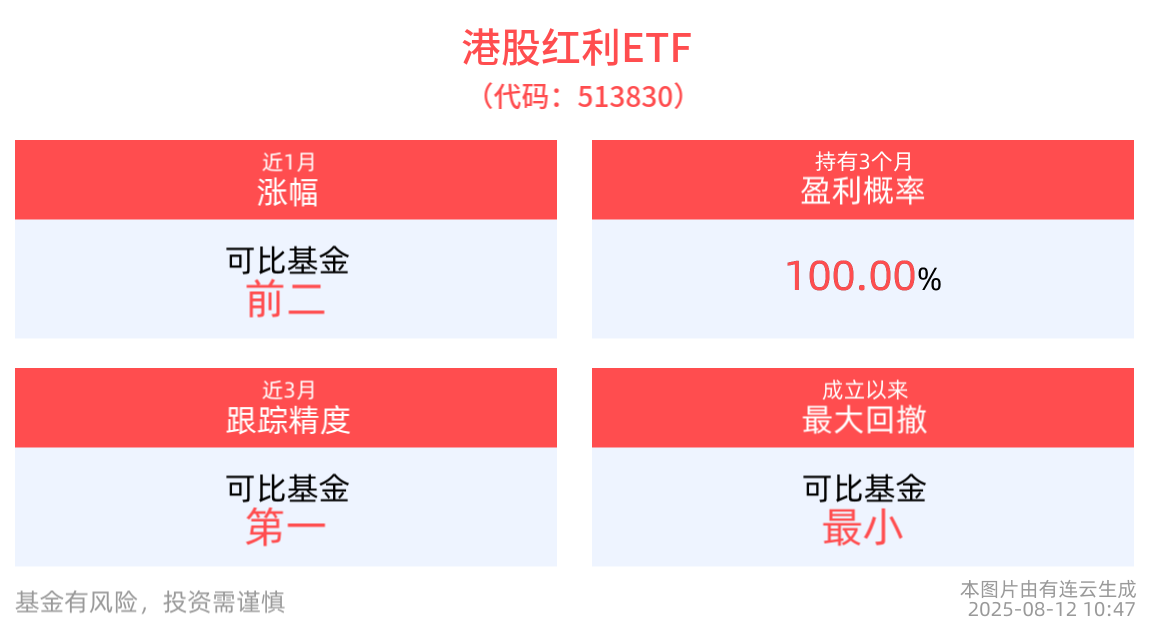 從收益能力看,截至2025年8月11日,港股紅利ETF自成立以來,最高單月回報為8.42%,最長連漲月數為3個月,最長連漲漲幅為19.07%,上漲月份平均收益率為4.60%。
