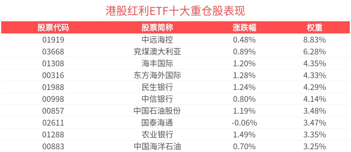 數據顯示,截至2025年7月31日,中證港股通高股息投資指數前十大權重股分別為中遠海控、兗煤澳大利亞、國泰海通、東方海外國際、民生銀行、海豐國際、中信銀行、中國石油股份、中國海洋石油、中國神華,前十大權重股合計佔比47.67%。
