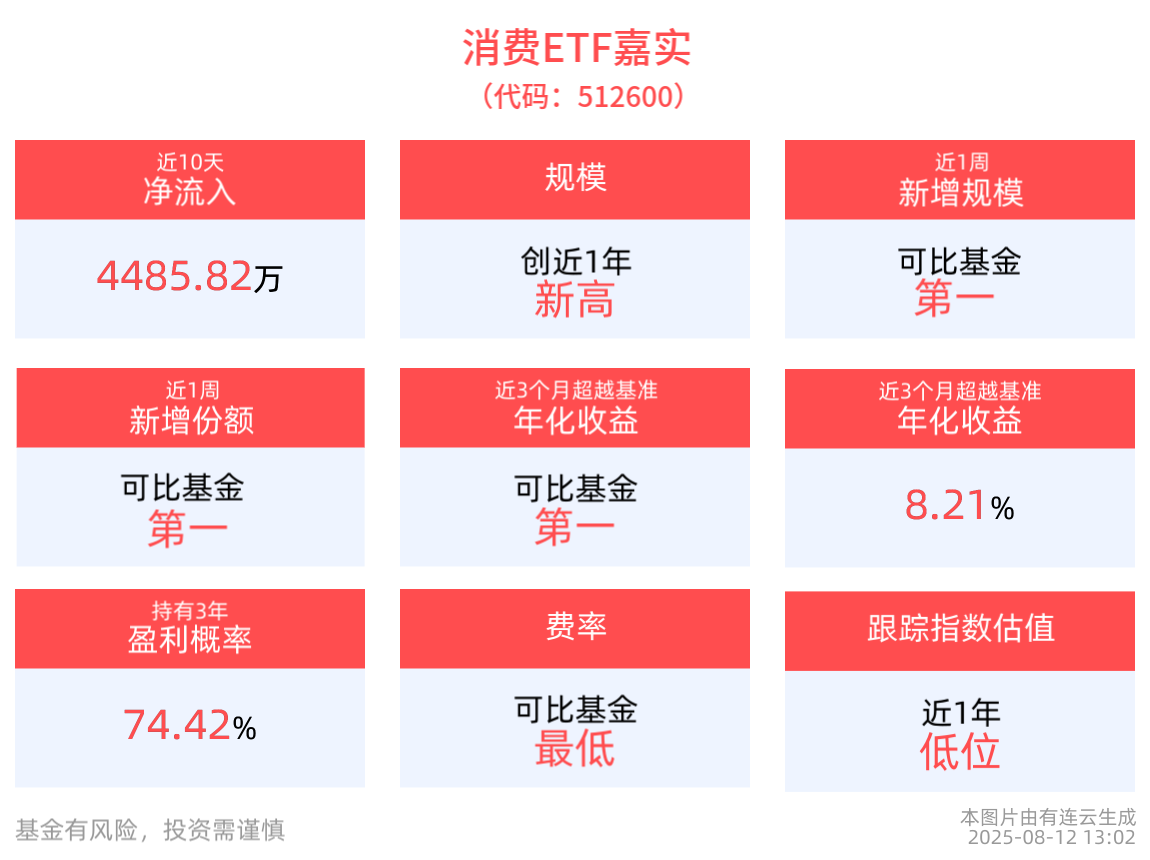 資金流入方面,拉長時間看,消費ETF嘉實近10個交易日内有8日資金淨流入,合計「吸金」4485.82萬元。