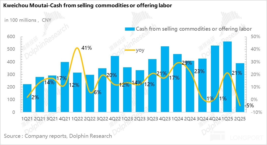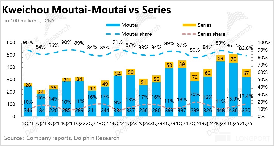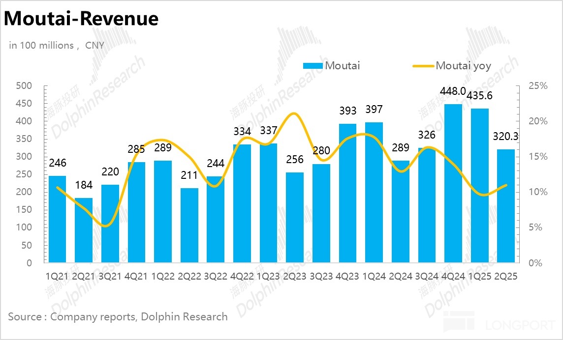 2Q25 茅台酒實現營收 320 億元,同比增長 11%,考慮到二季度飛天控貨挺價力度加大,海豚君推測茅台酒的增長更多來源於非標酒投放增加所帶來的貢獻。