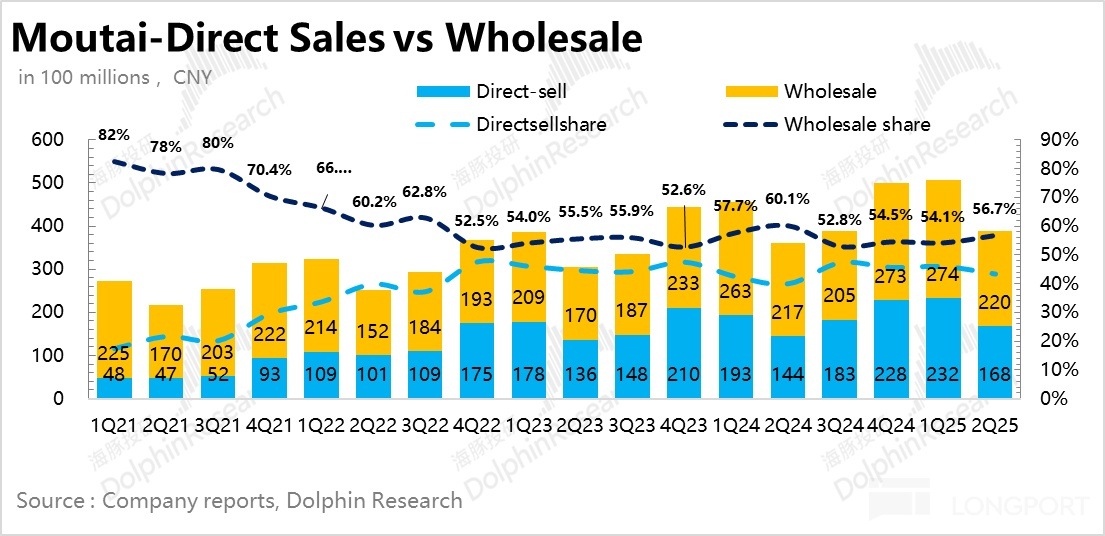 4、直銷渠道佔比提升:從渠道結構上看,2Q25 茅台直營渠道銷售佔比為 43.3%,同比提升 3.4pct,核心原因在於茅台二季度加大了 i 茅台和團購渠道上非標茅台的投放,而經銷渠道由於係列酒下滑嚴重,僅同比增長了 1.5%。