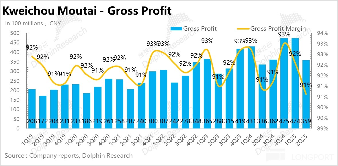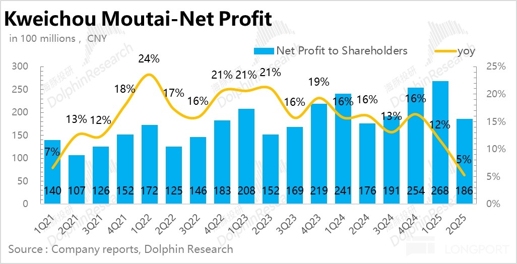 總體來說,由於白酒企業可以通過向渠道壓貨延緩業績沖擊,因此報表業績壓力最大的節點往往要滯後於實際的終端消費低估,茅台作為白酒總龍頭也不例外,從終端開瓶率上看,雖然上半年優於 2024 年同期水平,但消費疲軟的滯後效應明顯已經傳導到報表端,Q2 業績進一步放緩雖然早已在預期内,但係列酒下滑的 「慘烈」 程度整體還是超出了海豚君的預期。
